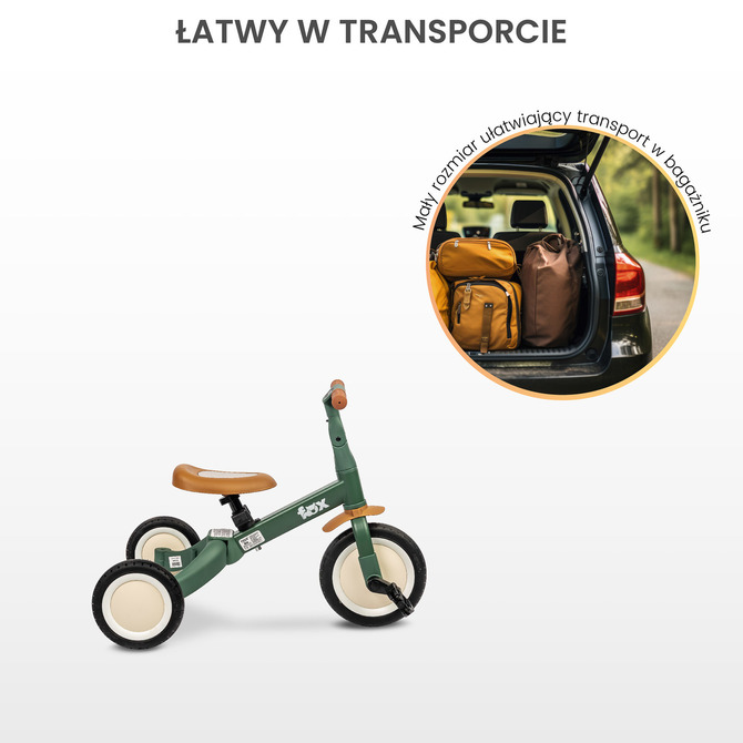 Zahvaljujući promišljenom dizajnu, bicikl ima četiri funkcije – bicikl na guranje, balans bicikl, tricikl s pedalama i bicikl s dva kotača s pedalama, prilagođavajući se potrebama i vještinama djeteta u svakoj fazi razvoja. Bicikl je namijenjen djeci od 18 mjeseci do otprilike 5 godina i može sigurno nositi djecu težine do 25 kg.