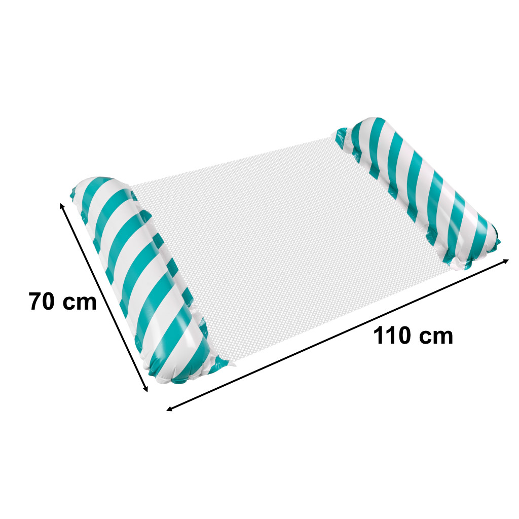 Madrac za plivanje na napuhavanje s plavim i bijelim prugama s mrežicom – savršen za odmor. Pluta do 70 kg i lako može stati u vašu prtljagu. Dimenzije: 110 cm x 70 cm, boja: plava