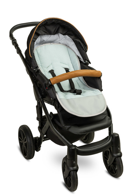 Zahvaljujući univerzalnoj podlozi za kolica s vodootpornim osloncem za noge, svatko može promijeniti izgled kolica. Dvostrana podloga ima glatki pamuk s modernim uzorkom s jedne strane, dok je s druge strane jednobojni pamuk s strukturom vafla. Na obje strane, na dnu, nalazi se šareno, lako održivo umjetno kožno područje. Podloga pomaže u održavanju unutrašnjosti kolica čistom i povećava udobnost putovanja. Dodatno, ima otvore za sigurnosne pojaseve i traku kojoj se može pričvrstiti odgovarajući jastuk.
